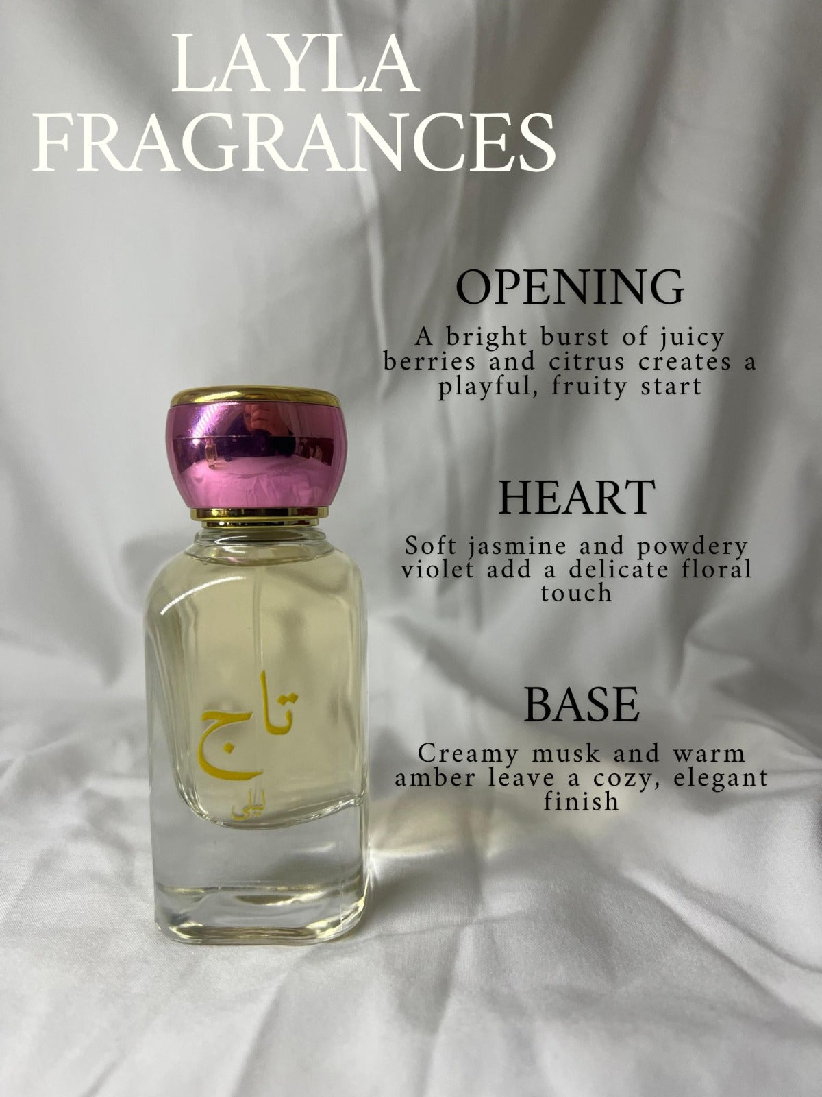 تاج هو العطر المثالي للأشخاص اللي بتعبر عن حيويتها وثقتها بنفسها. بيبدأ بمزيج شهي من التوت الأحمر والكشمش الأسود، لانطلاقة فاكهية حلوة مليئة بالطاقة. في القلب، يكشف عن مزيج ساحر من الياسمين والبنفسج، ليضيف لمسة زهرية ناعمة وأنيقة. وأخيرًا، نوتات القاعدة من المسك الكريمي والعنبر بتقدم إحساسًا دافئًا وثباتًا لا يُنسى.